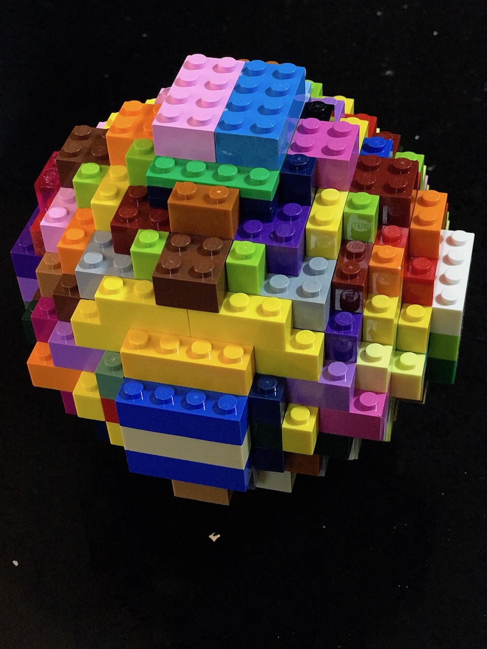 搭建方式有两种,一是搭好两个半球,拼起来,另一方方法是搭好一个半球后,反过来底部朝上,再将积木反向慢慢搭上去。